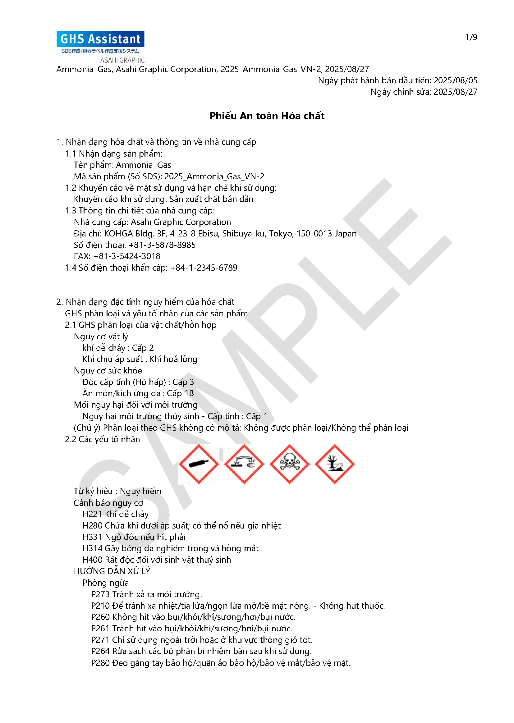 半導体製造に用いられるアンモニアガスのベトナム向けベトナム語SDSです。EU CLP ANNEX VI のTable 3のGHS分類結果を用い、ベトナムの許容濃度を出力しています。