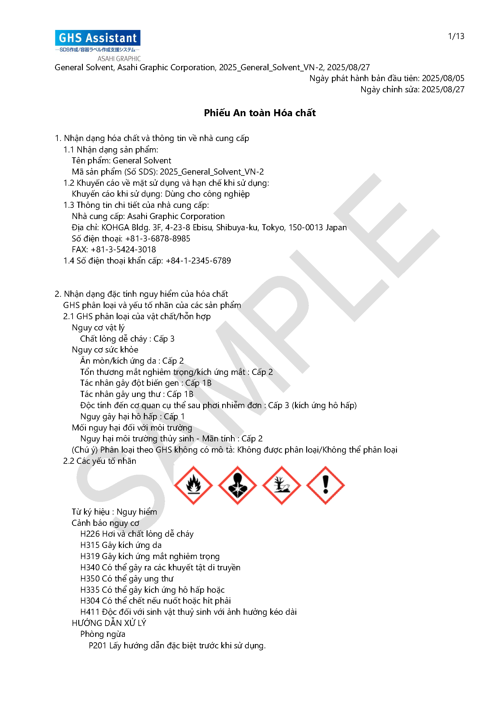 汎用的な工業用の有機溶剤のベトナム向けベトナム語SDSです。